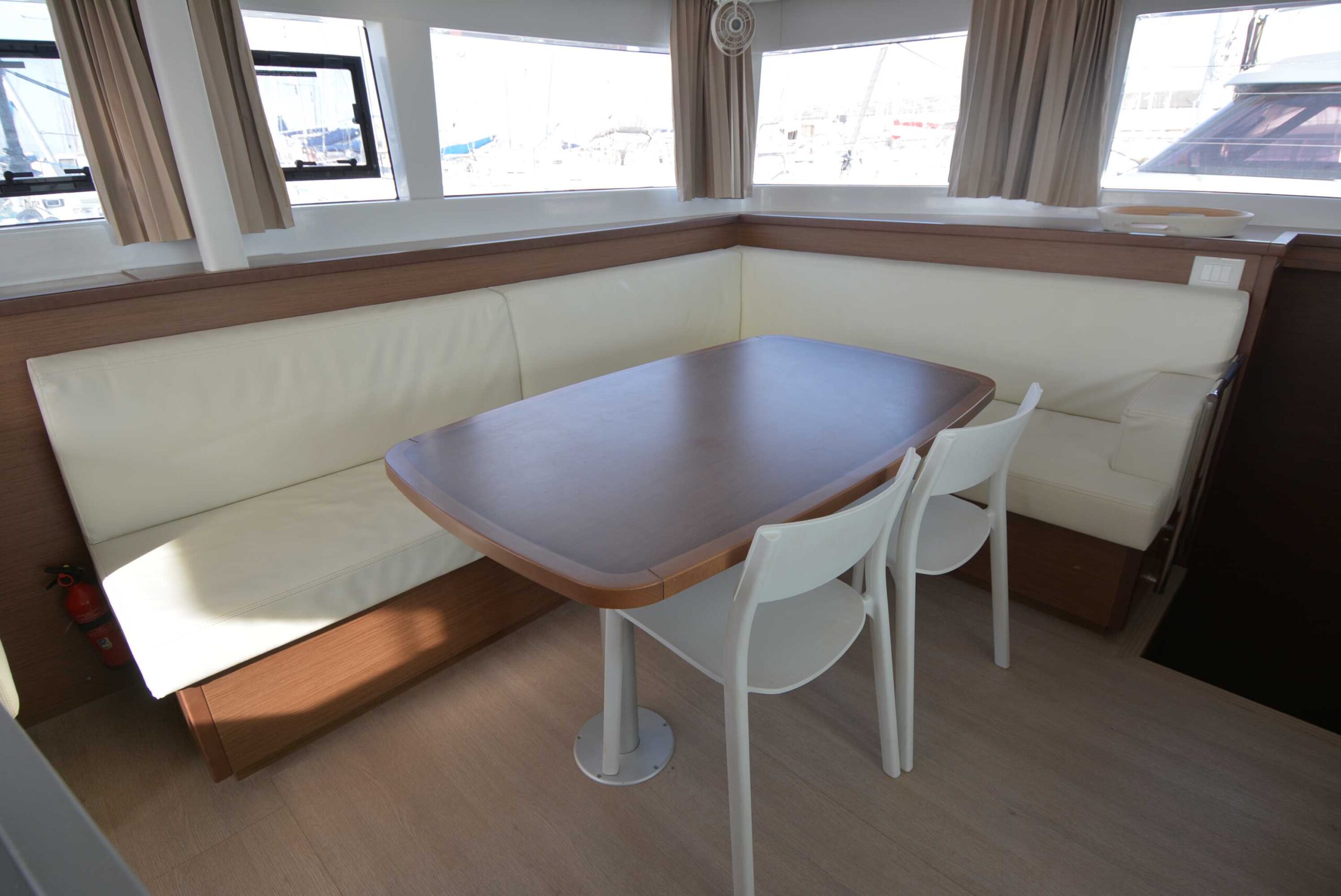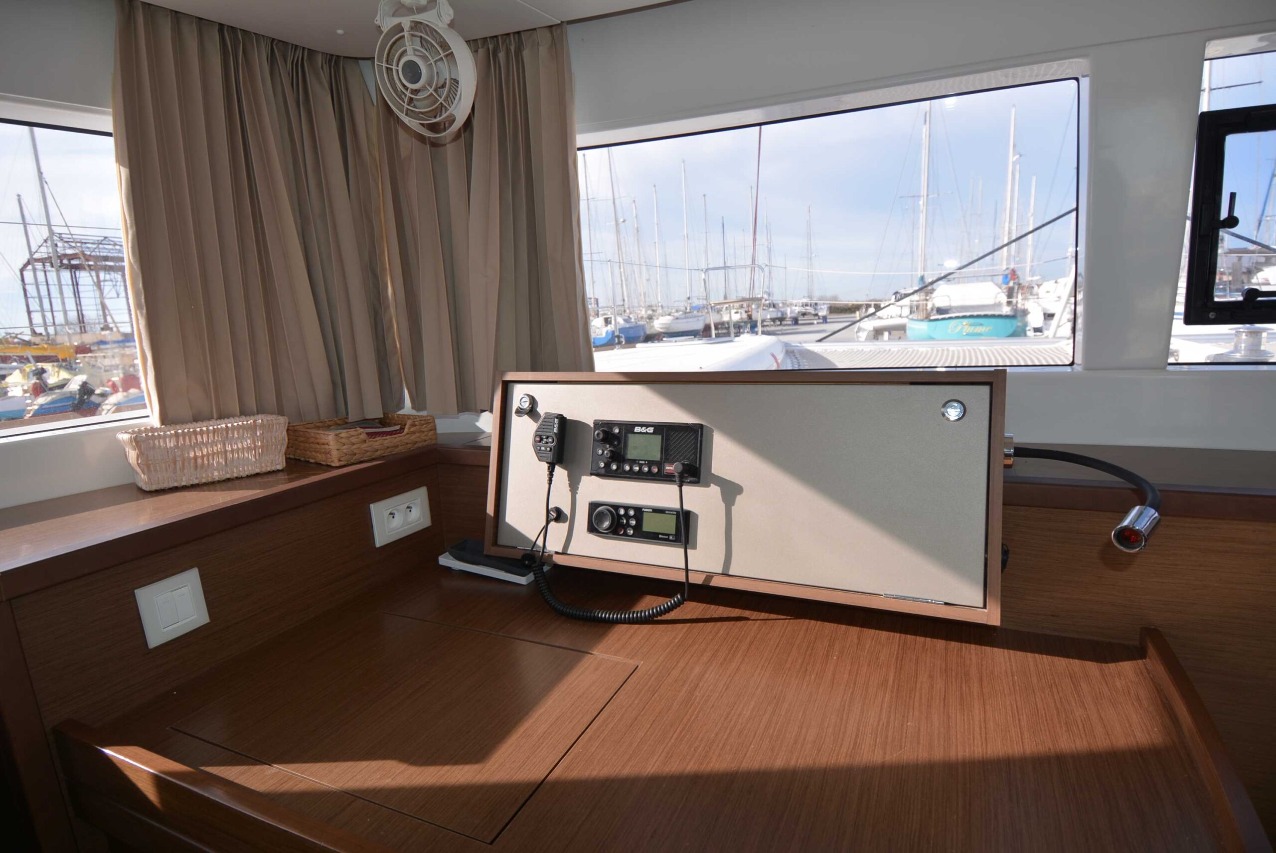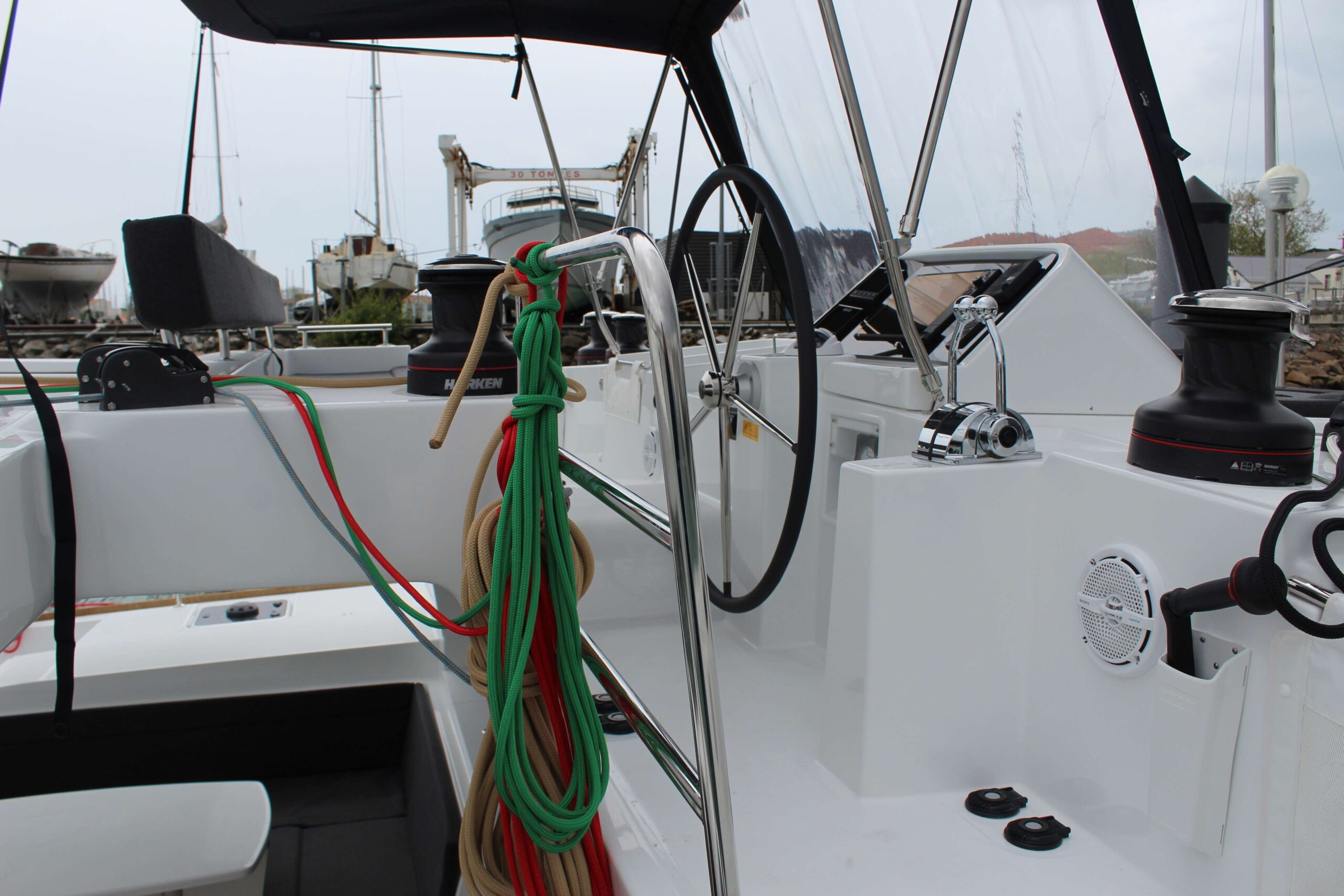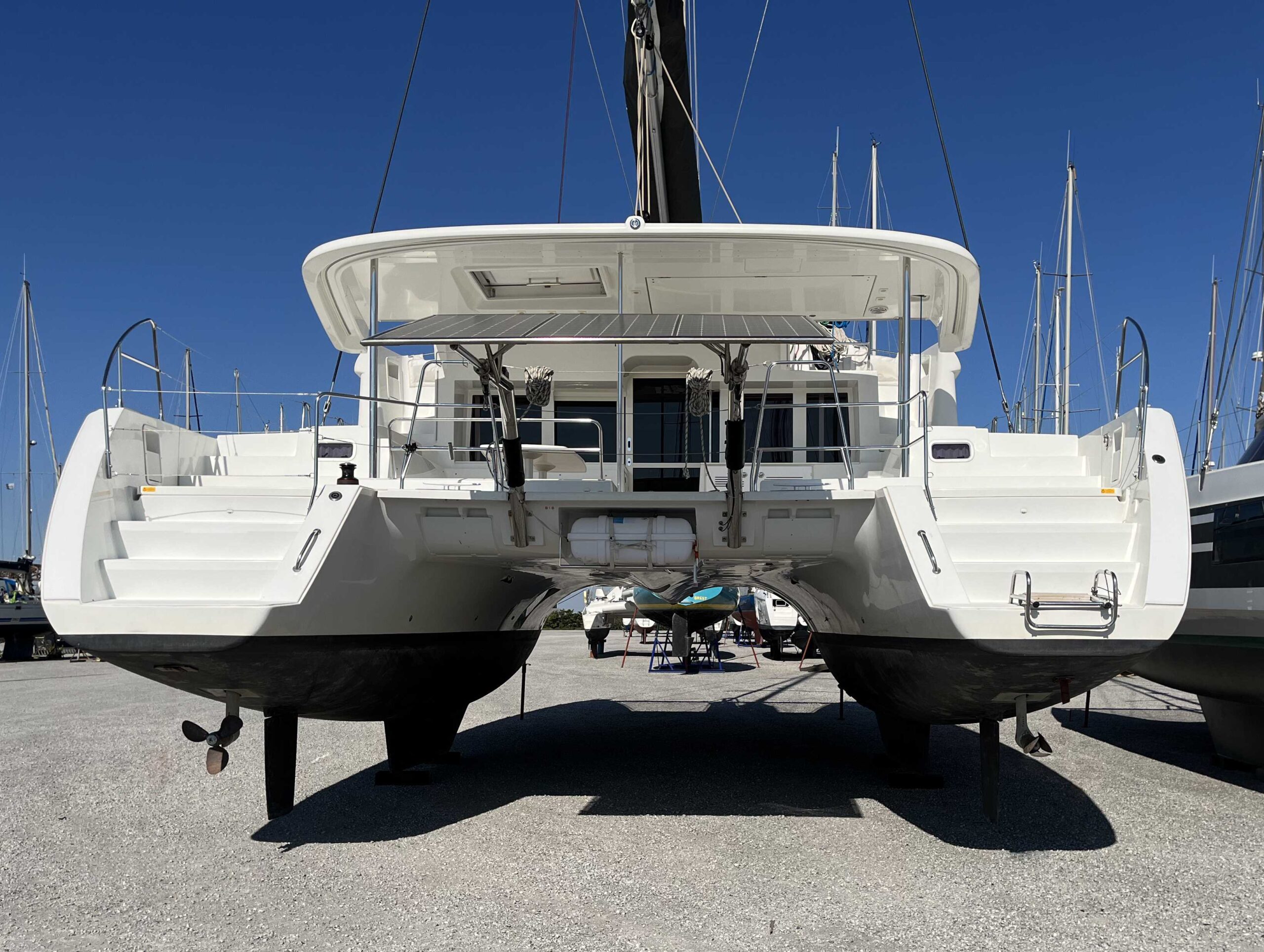Catamaran d'occasion Lagoon 450 Fly de juin 2019 disponible immédiatement. Il a été peu exploité en Corse 4 saisons et peut continuer son programme de gestion. Motorisation en 57 cv, Annexe 3.4 avec HB 20cv, 3 panneaux solaires, groupe, dessalinisateur. La TVA est récupérable. Il est visible à terre à Port Navy Service sur rendez vous, contact Philippe Froment ou Christophe Buhot.