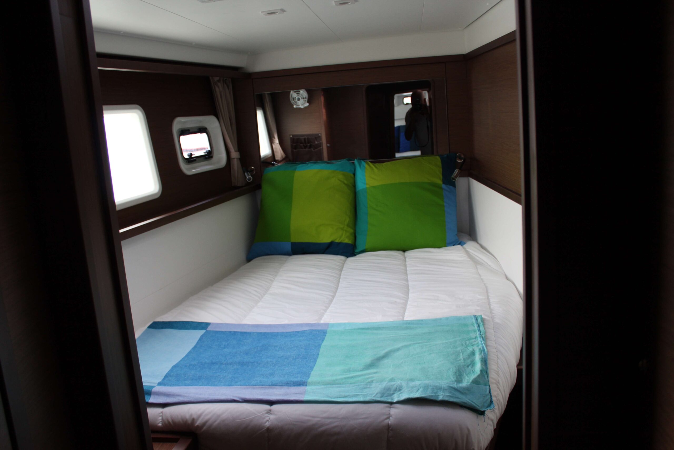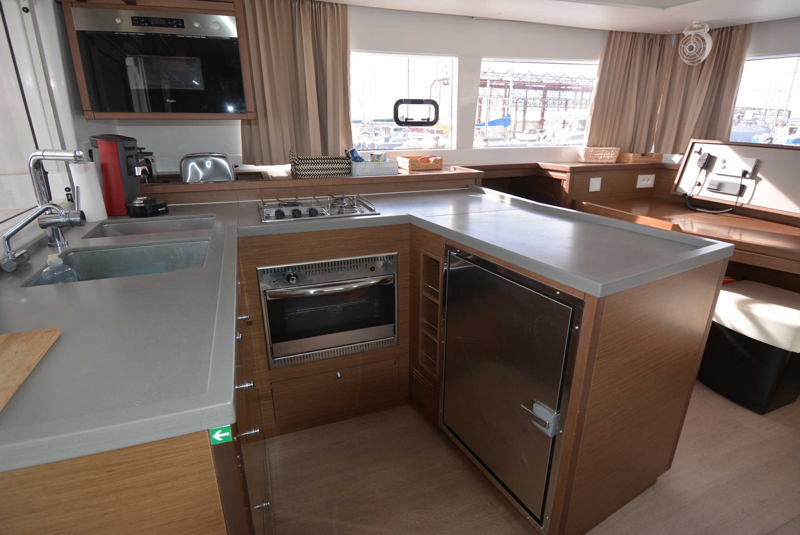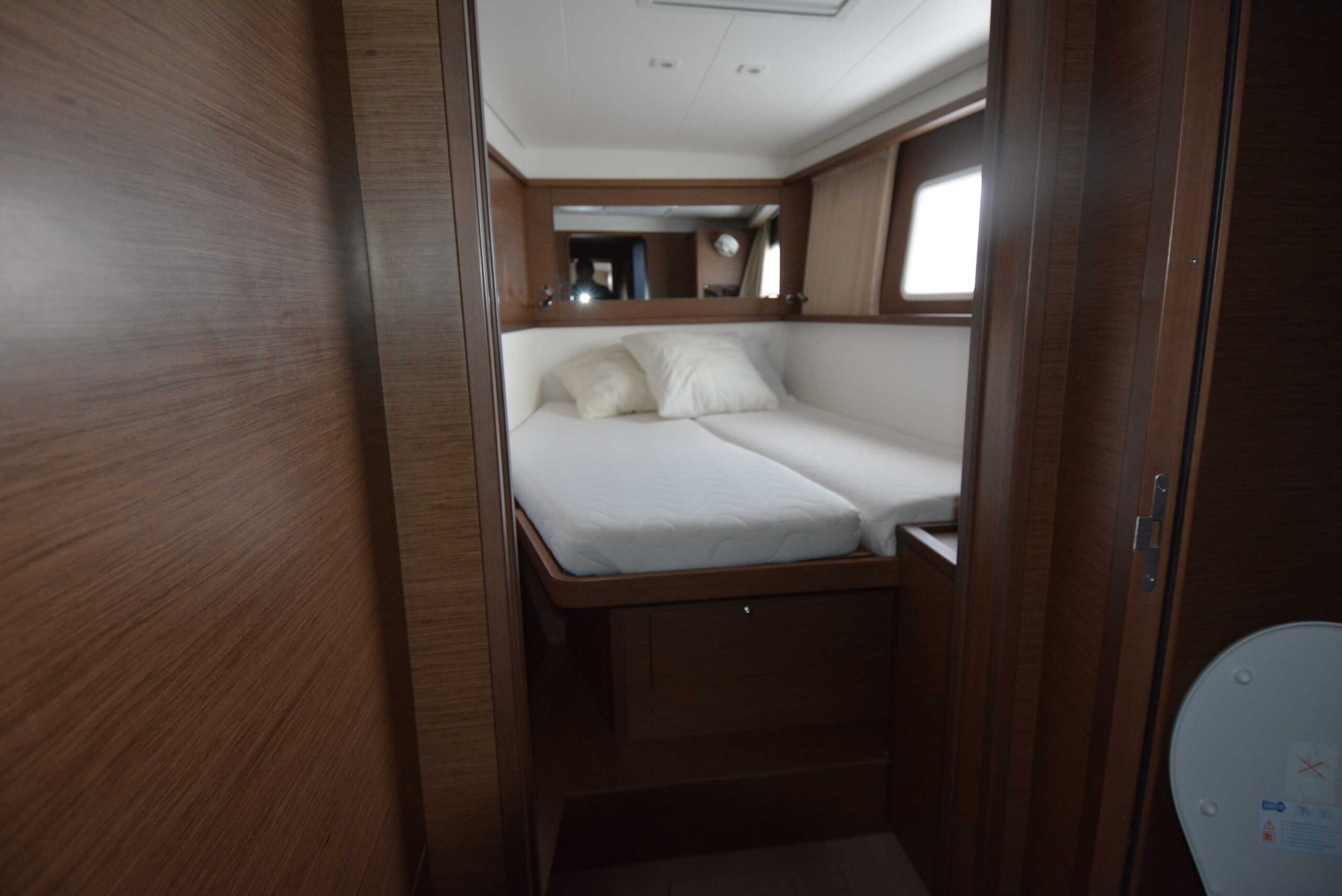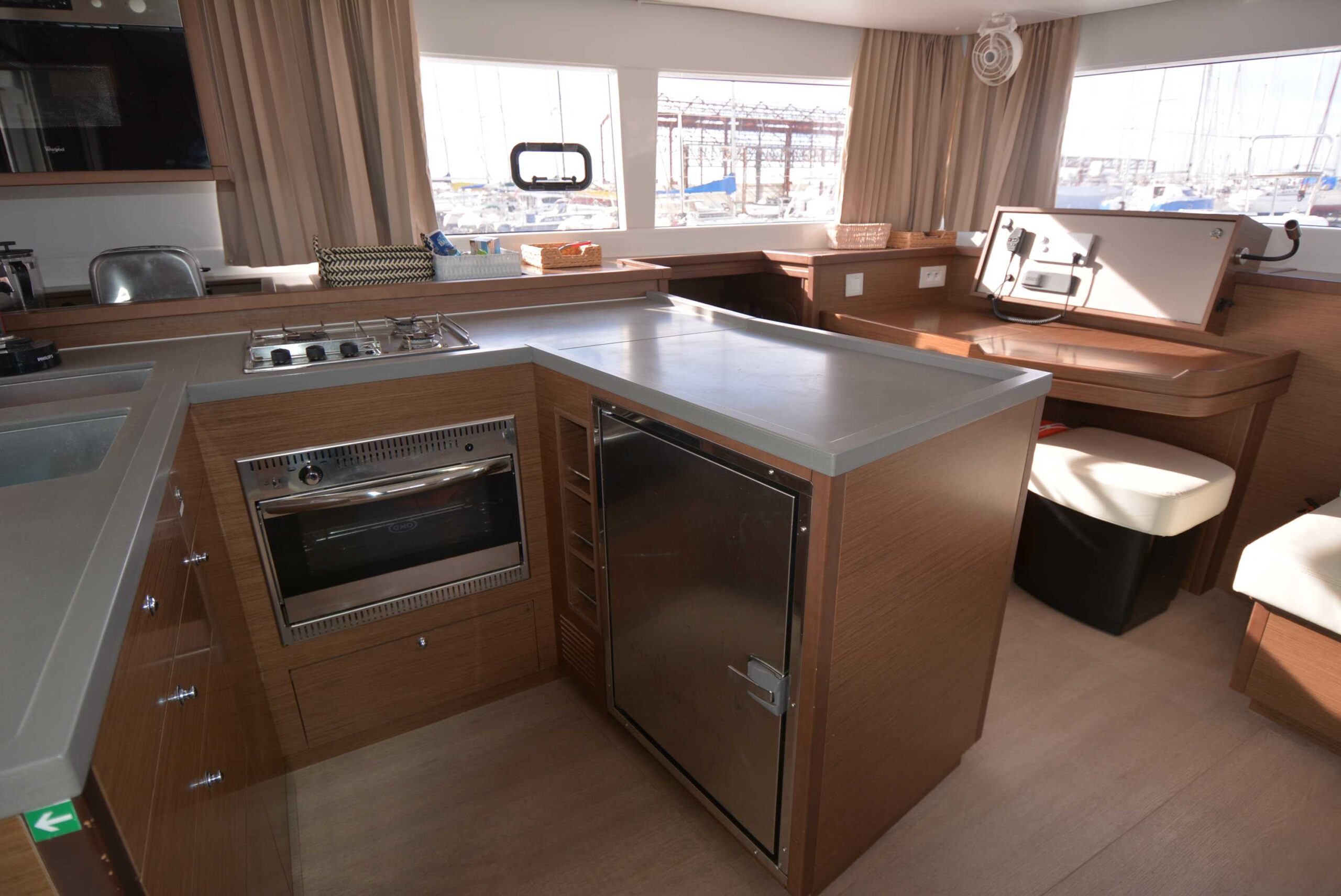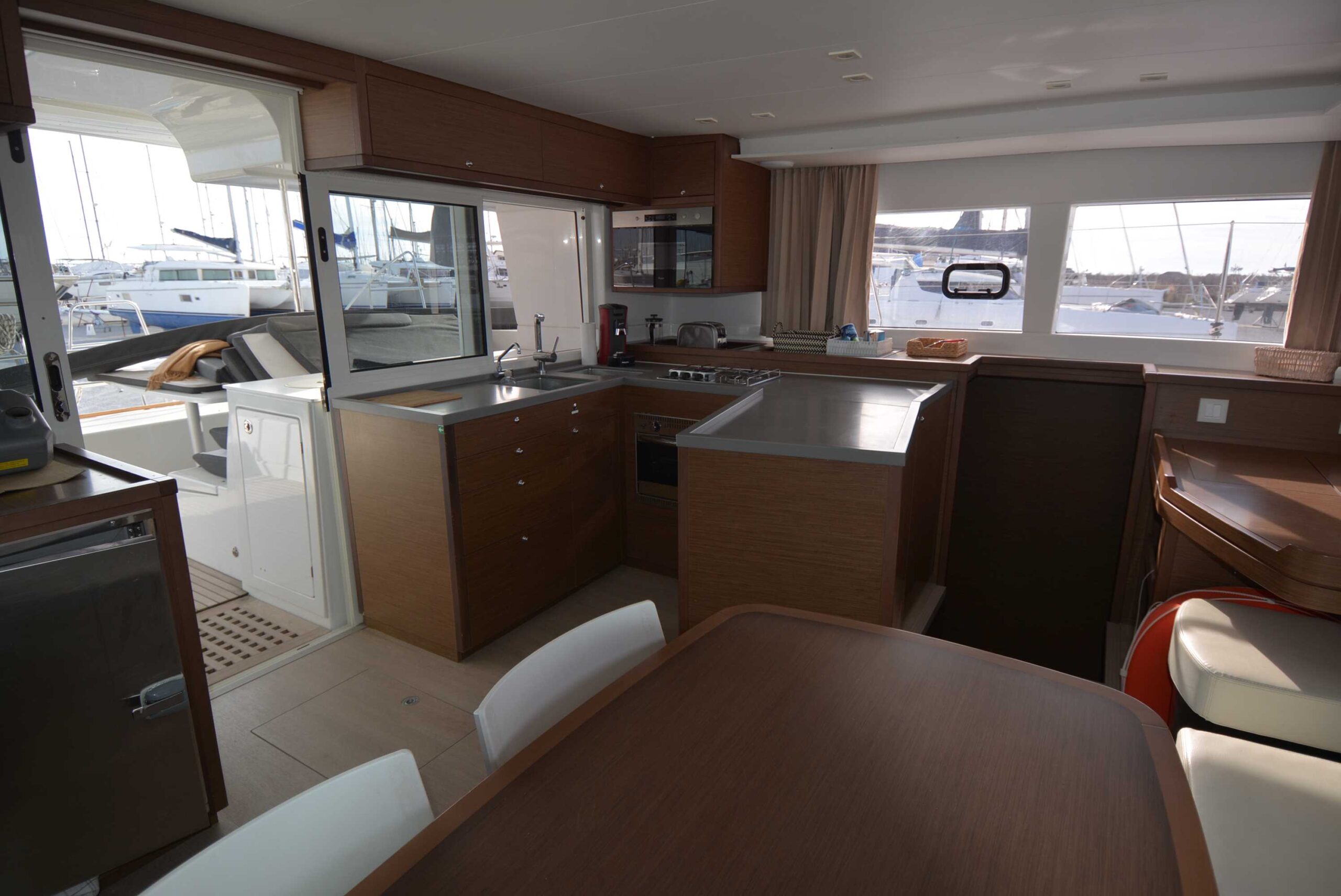 Catamaran d'occasion Lagoon 450 Fly de juin 2019 disponible immédiatement. Il a été peu exploité en Corse 4 saisons et peut continuer son programme de gestion. Motorisation en 57 cv, Annexe 3.4 avec HB 20cv, 3 panneaux solaires, groupe, dessalinisateur. La TVA est récupérable. Il est visible à terre à Port Navy Service sur rendez vous, contact Philippe Froment ou Christophe Buhot.