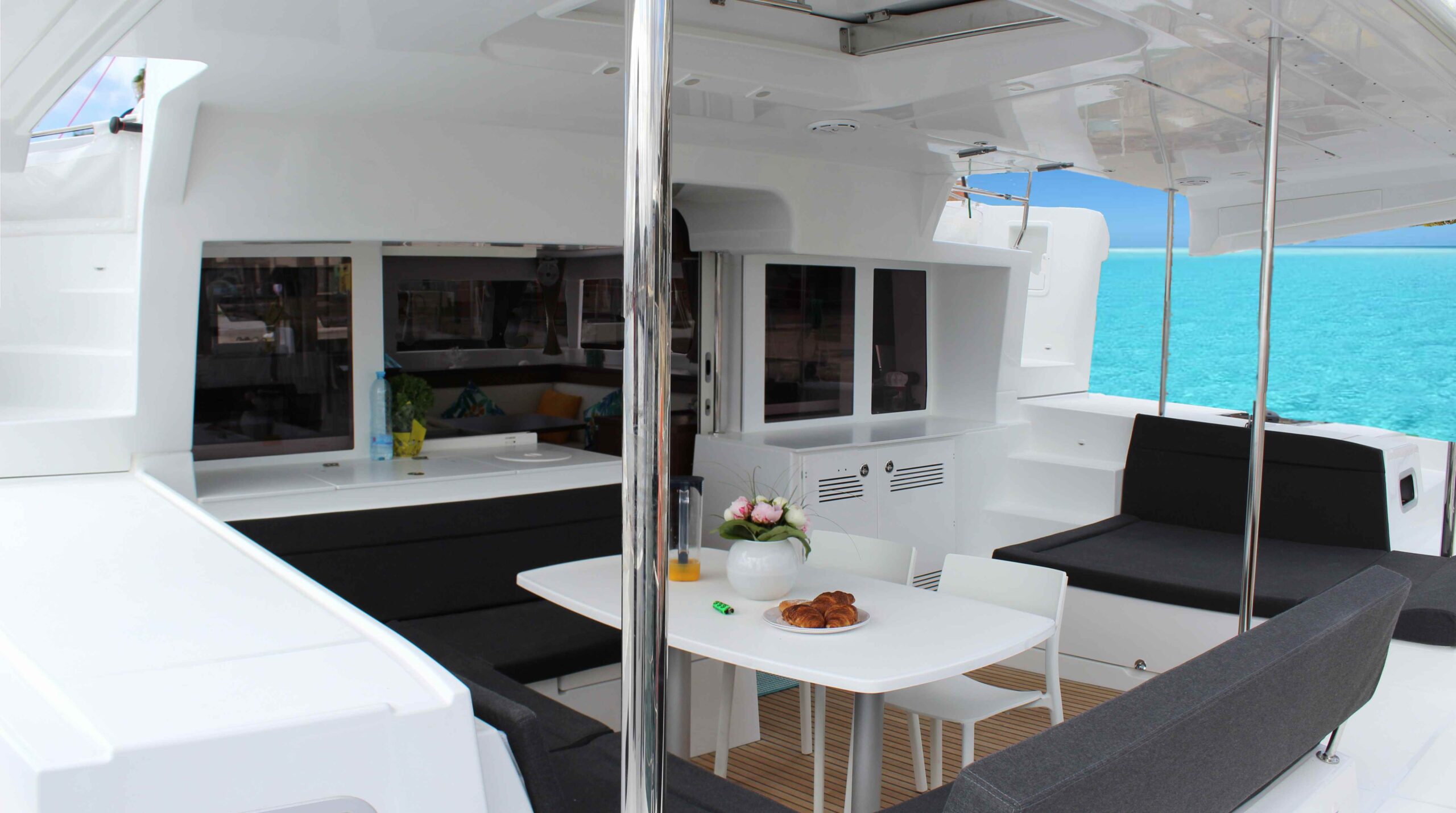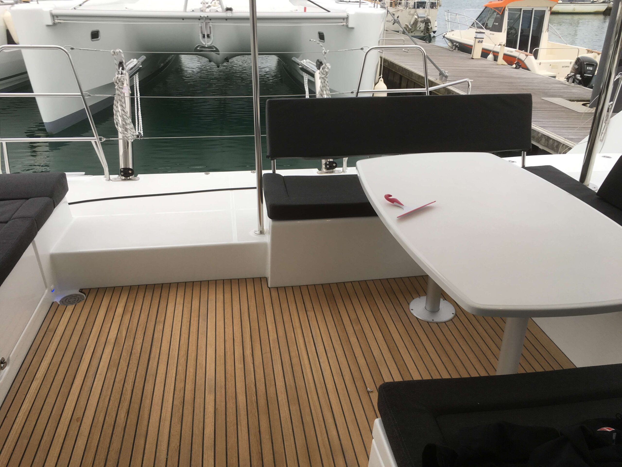 Bossoirs Passerelle hydraulique Cockpit teck Pont teck Plateforme de bain Echelle de bain Douchette de cockpit Table de cockpit Eclairage de cockpit Bain de soleil avant Bain de soleil arrière Coussins de cockpit Bimini top Taud de fermeture arrière |